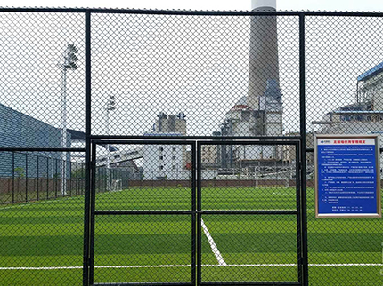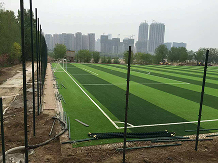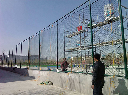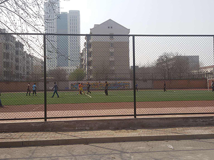 (6)足球場圍網球門:球門應設在每條球門線的中央,由兩根相距7.32米、與兩面角旗點相等距離、直立門柱與一根下沿離地面2.44米的水平橫木連接組成,為確保安全,無論是固定球門或可移動球門都必須穩定地固定在場地上。門柱及橫木的寬度與厚度,均應對稱相等,不得超過12厘米。 球網附加在球門后面的門柱及橫木和地上。球網應適當撐起,使守門員有充分活動的空間。